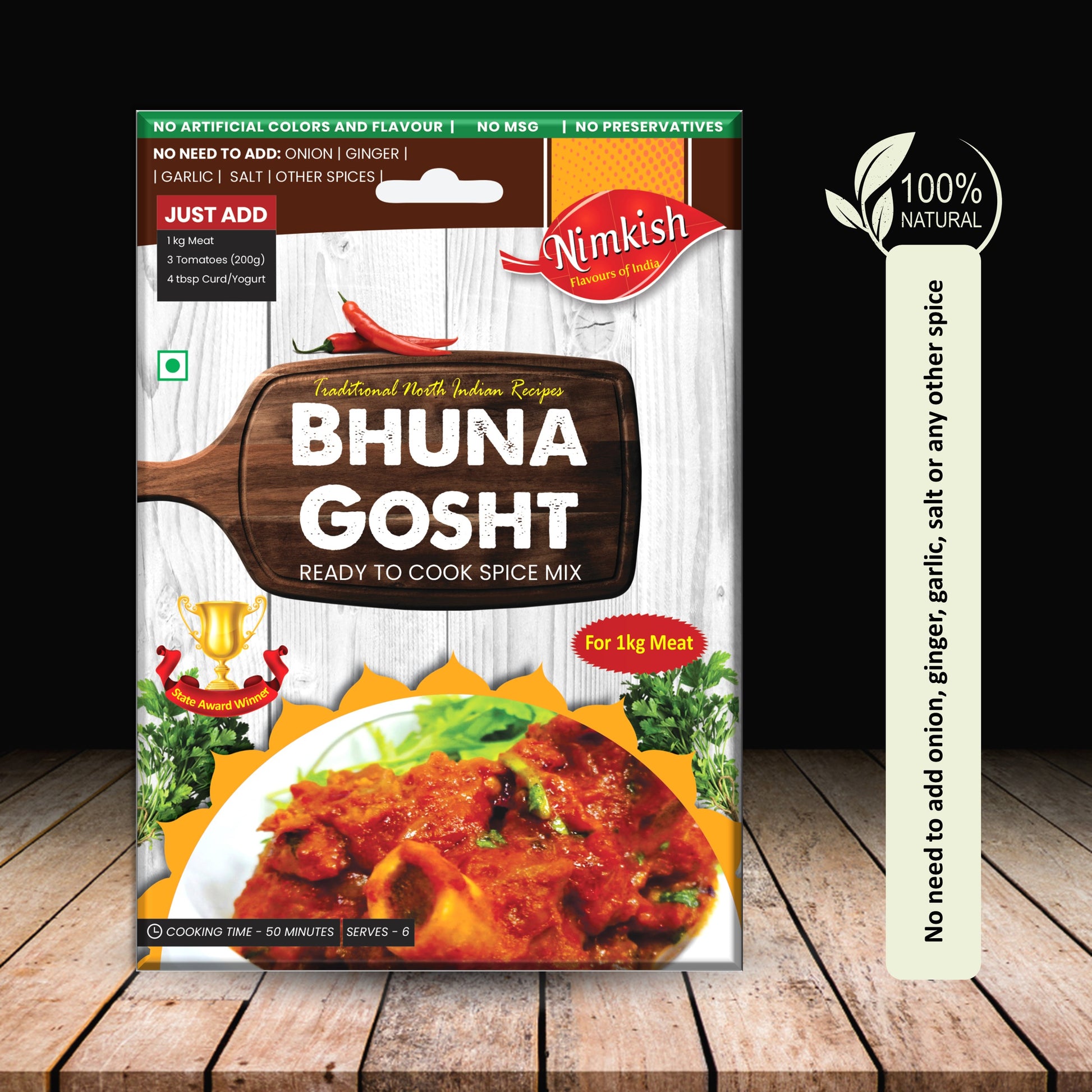 1. To 1 kg meat pieces (any kind of meat), rub 1 pack Nimkish Bhuna Gosht Masala with 4 tbsp oil, 4 tbsp (100g) yogurt (plain curd) and 3 (200g) crushed tomatoes.