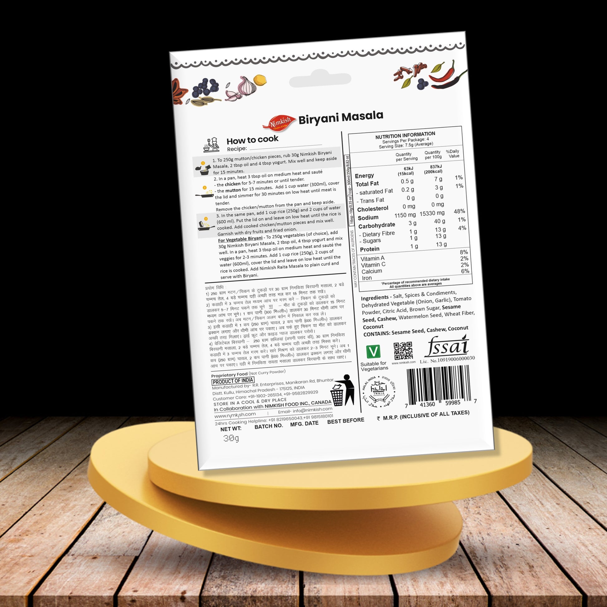 For Vegetable Biryani - To 250g vegetables (of choice), add 1 pack of Nimkish Biryani Masala, 2 tbsp oil, 4 tbsp yogurt and mix well. In a pan, heat 3 tbsp oil on medium heat and sauté the veggies for 2-3 minutes. Add 1 cup rice (250g), 2 cups of water (600ml), cover the lid and leave on low heat until the rice is cooked. Add Nimkish Raita Masala to plain curd and serve with Biryani.