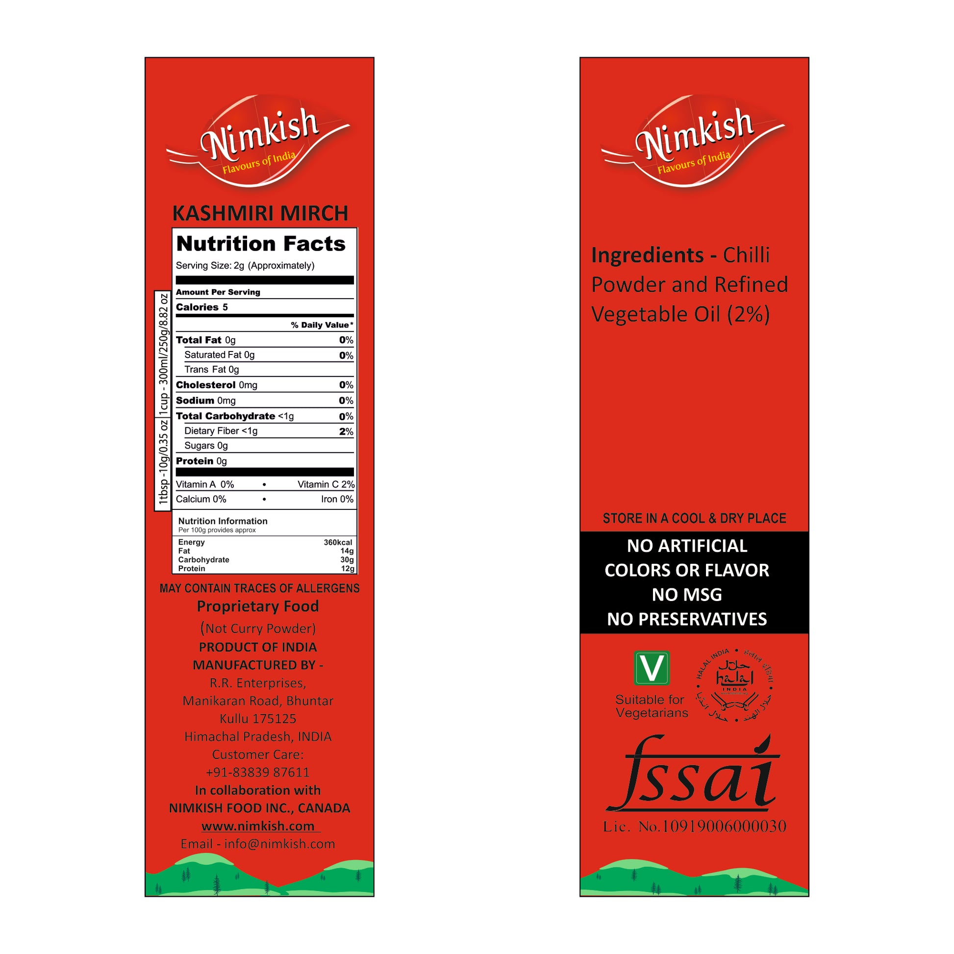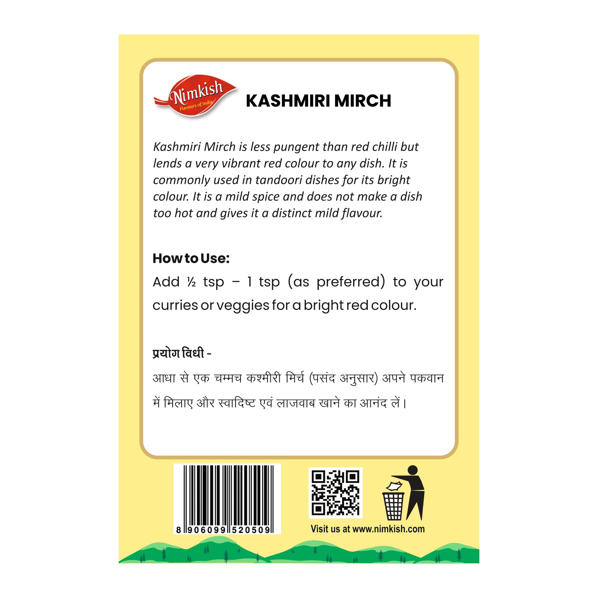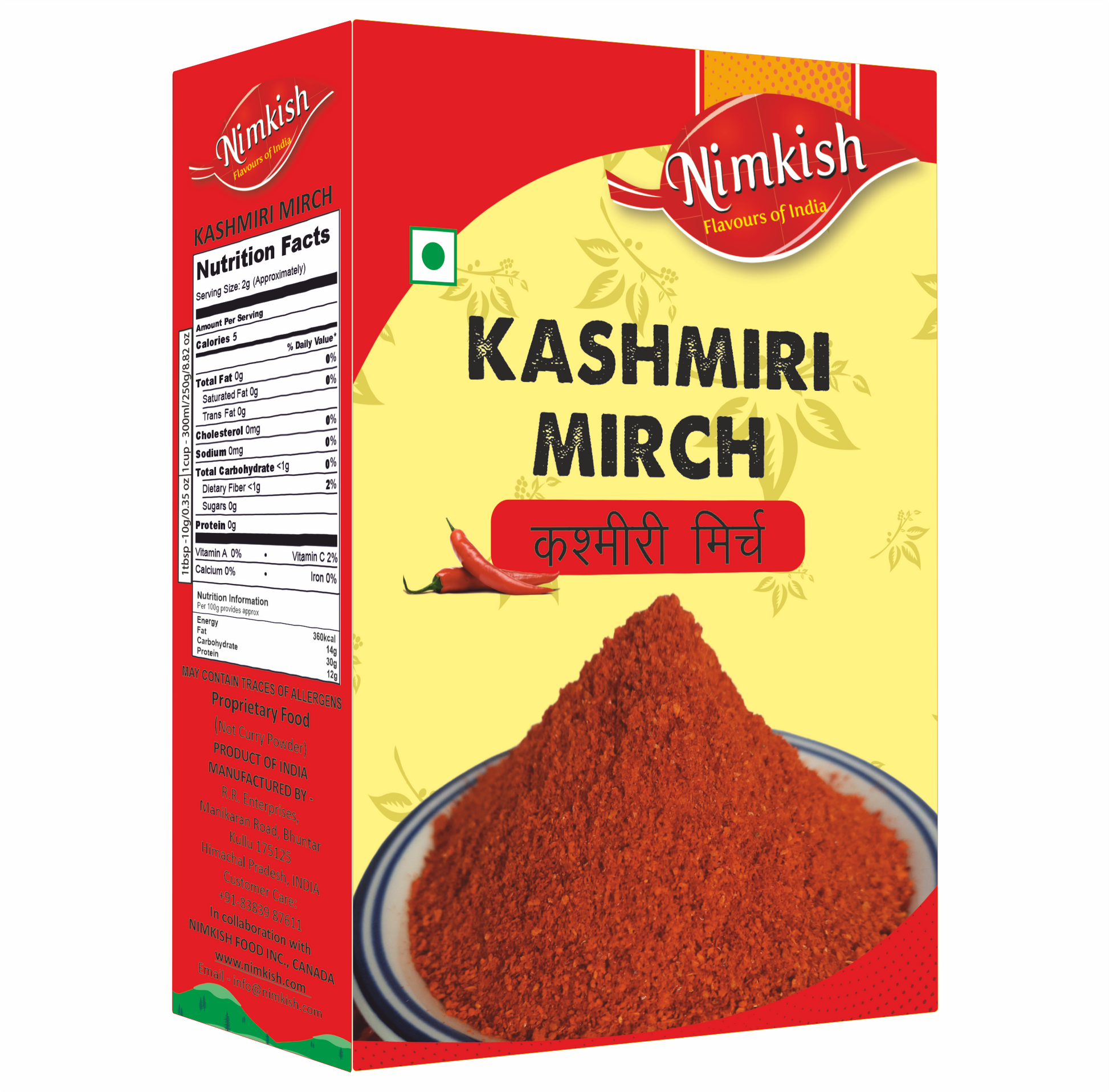 Nimkish Kashmiri Mirch Powder is a unique and flavorful way to spice up any meal. Crafted with the grinding of whole chillies, this 100g powder will add an extra kick and colour to any dish. Expertly crafted, this powder can take your meal to the next level with its authentic colour and flavour.