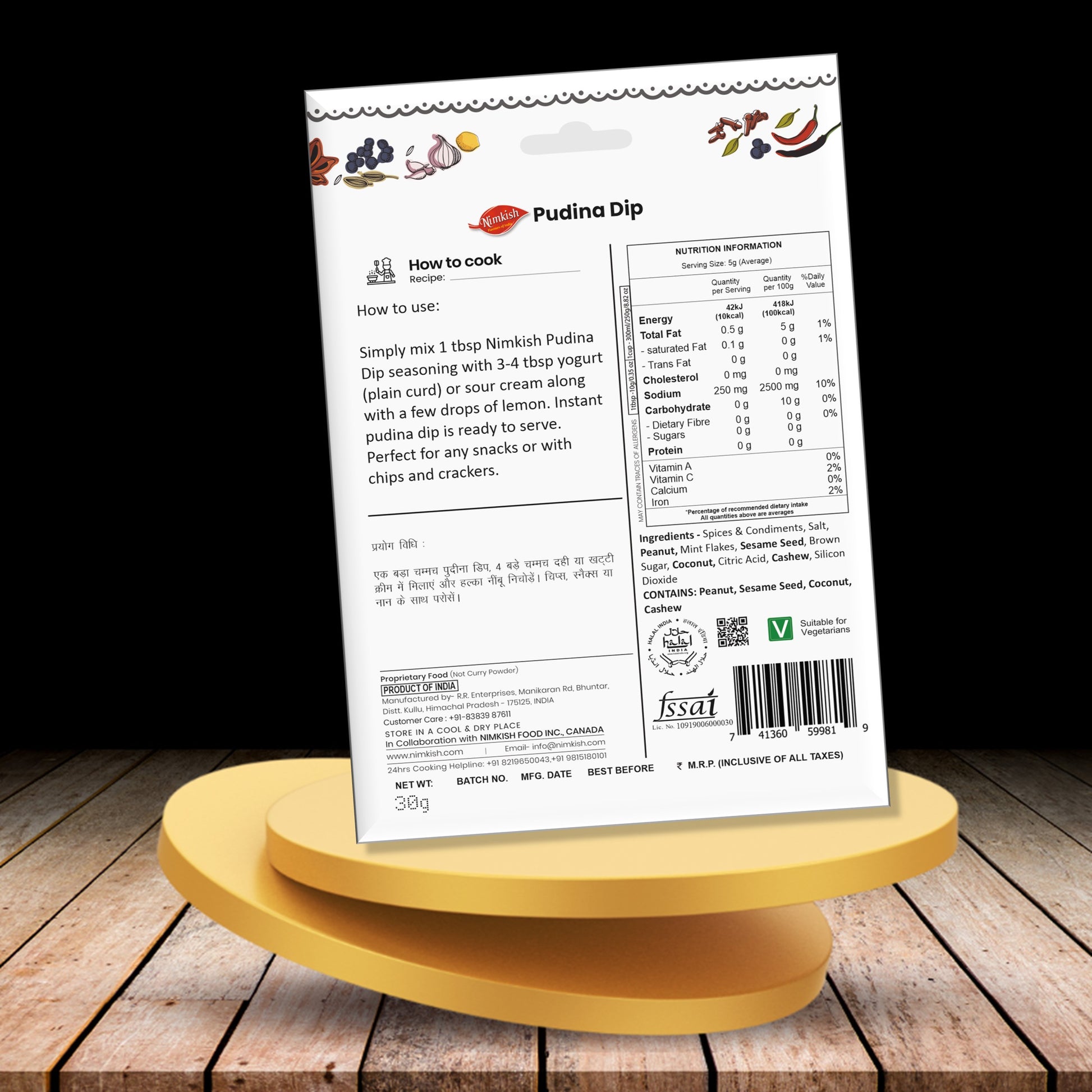Nimkish Pudina Dip Spice Mix offers an easy and tasty way to add flavor to your snacks. Made with mint and other spices, this blend can be quickly prepared in under 2 minutes. Enjoy the delightful taste of mint with your favorite snacks!