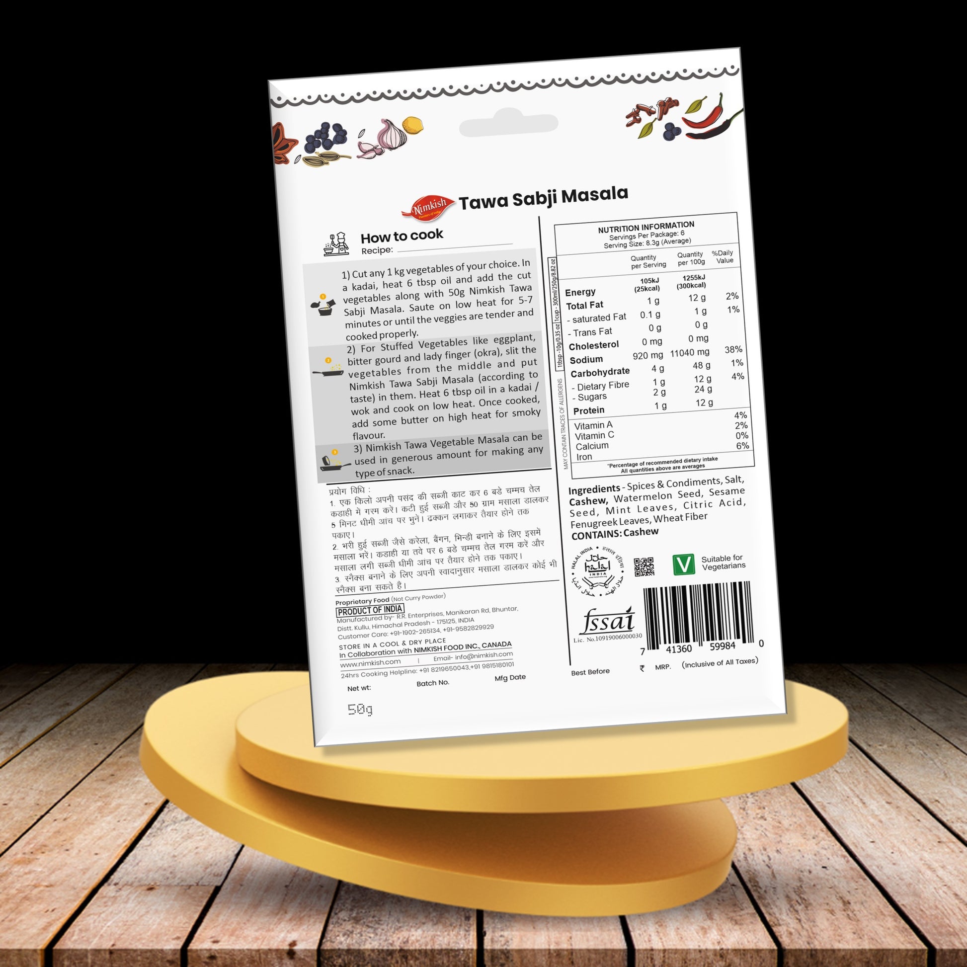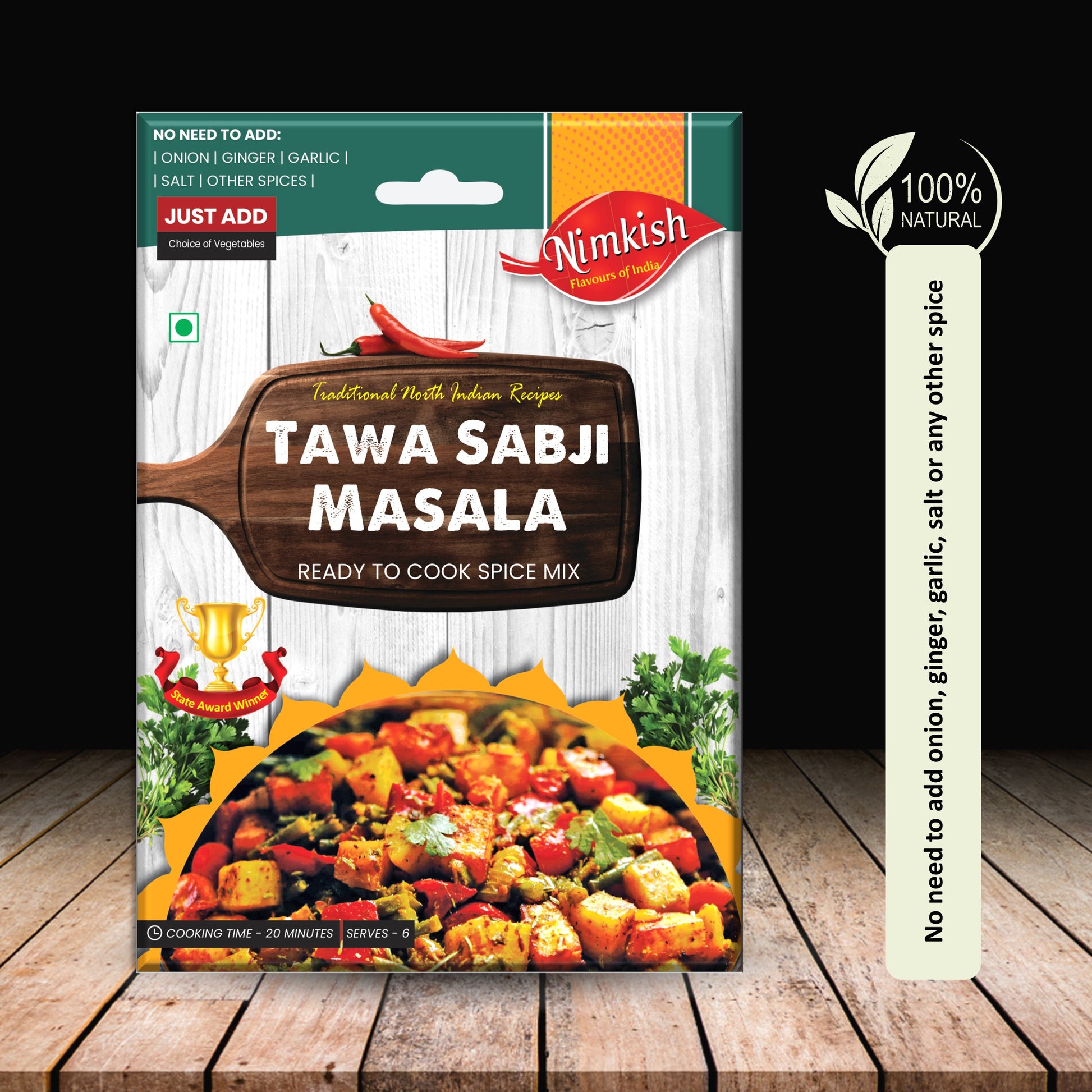 Nimkish Tawa Sabji Masala can be employed to stuff vegetables when making bharwan sabji or as a finishing touch on your veggies to add flavor. This masala requires no extra ingredients such as onions, ginger, garlic, or salt - simply sprinkle generously to create a delectable meal with no measurement or mixing of different spices necessary. Nimkish Tawa Sabji Masala provides a balanced blend of spices with just one spoonful, allowing you to enjoy a tasty and nutritious meal with minimal effort.